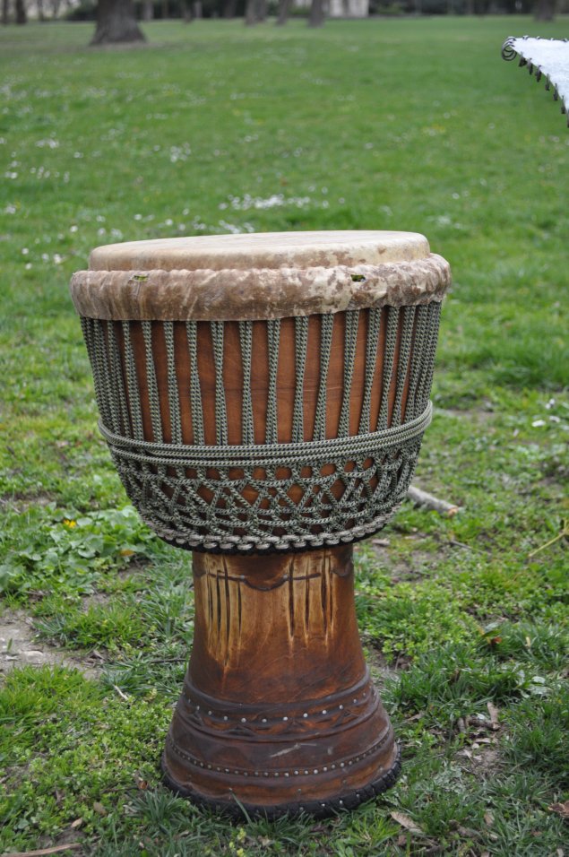 Africké djembe zo slovenskej dreviny, na ktorej môžete vidieť medvedie drápy (toto drevo bolo vybraté kvôli originalite, pretože v ňom boli zaryté medvedie drápy), koža je zo senegalskej kozy.